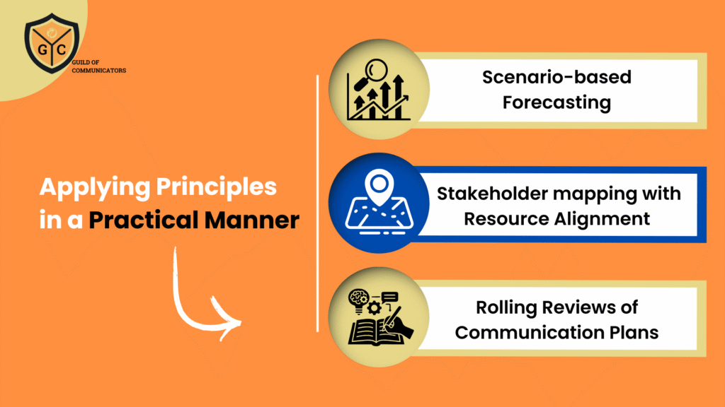 Together, these three methods—scenario forecasting, stakeholder alignment, and rolling reviews—ensure the five principles are applied consistently. They provide communicators with a practical way to move from presenting outputs to negotiating outcomes, from requesting resources to building support, and from being seen as operational to being recognised as strategic.